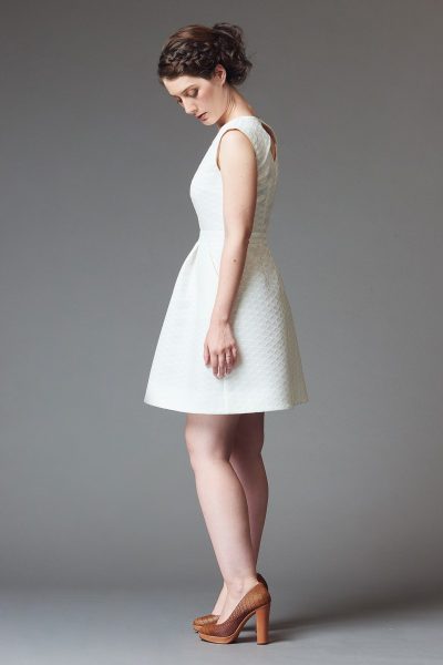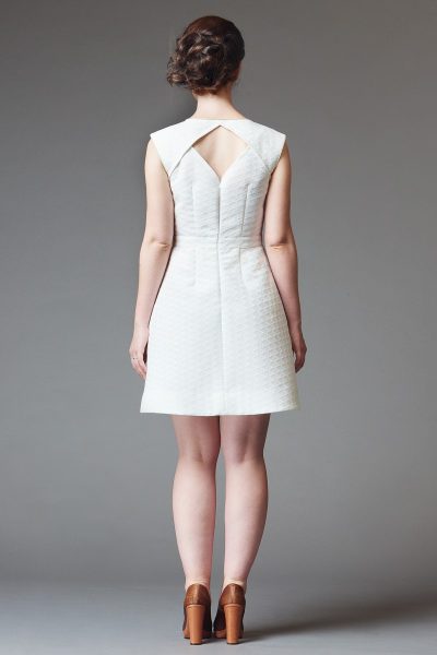 Sleeveless dress cinched at the waist, with an A-line skirt and diagonal pockets. Version A features a back cutout, and version B has a plain back.