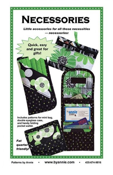 By Annie Necessories Pattern – Pretty and practical, these accessories are quick and easy to make using your favourite fabrics. Keep your reading glasses and sunglasses or mobile phone at hand in the 4″ x 7 1/2″ double eyeglass case. The 5″ x 7″ mini bag can be used for coins or makeup. the 4 1/2″ pocket wallet with velcro closure has a zippered pouch and a see through holder for your drivers license or business card.
