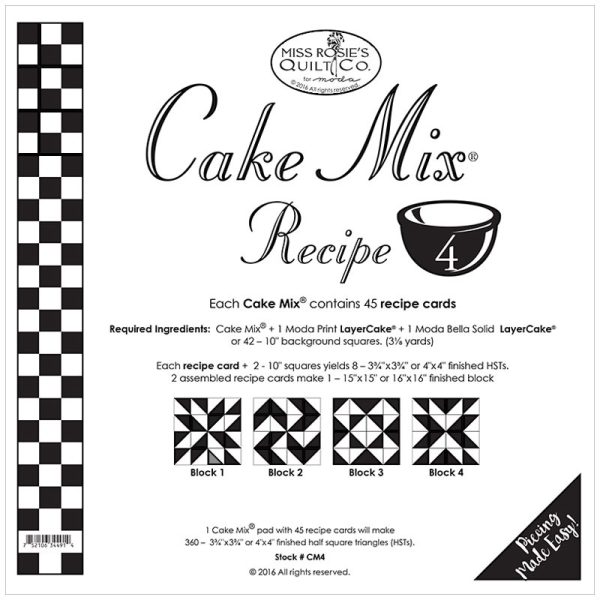 Each card, plus 2 x 10″ squares (layer Cakes) makes 8 – 3.75″x 3.75″or 4″ HST’s. 2 assembled recipe cards make 1 – 15″sq or 16″square finished blocks.